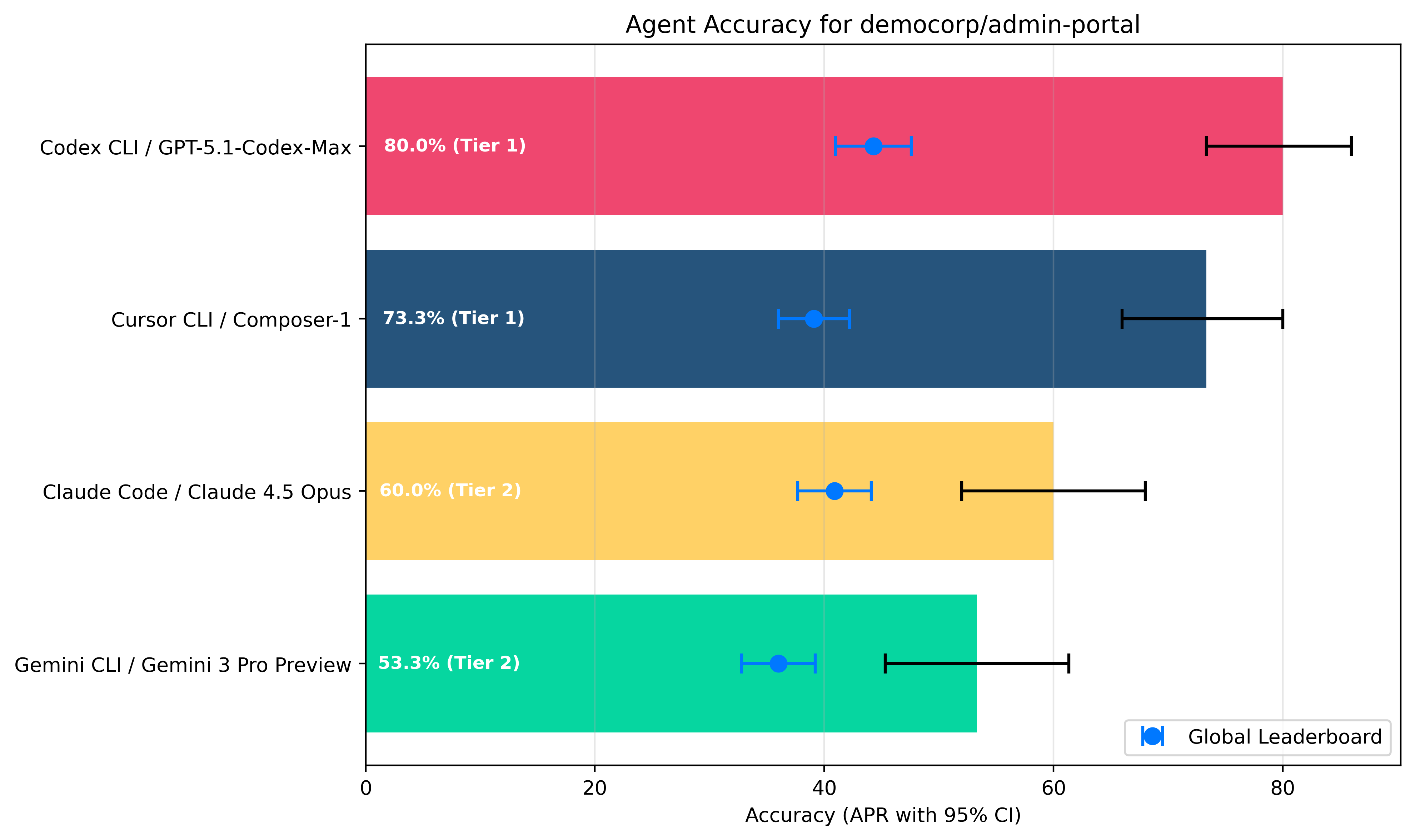 This benchmark evaluated coding agents on the democorp/admin-portal repository.