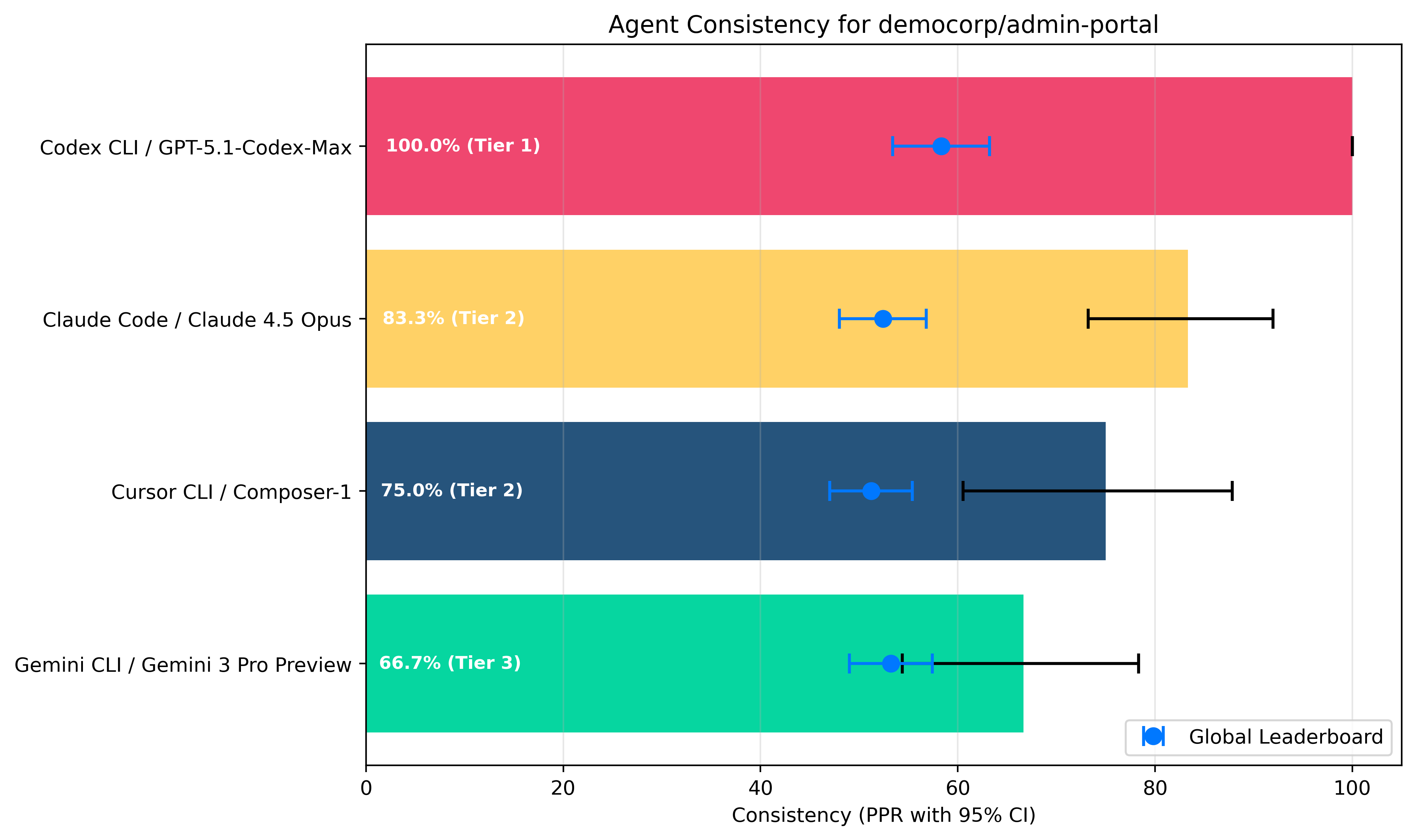 Again we're seeing vastly better average consistency scores across all agents when comparing to the global Sigmabench leaderboard.