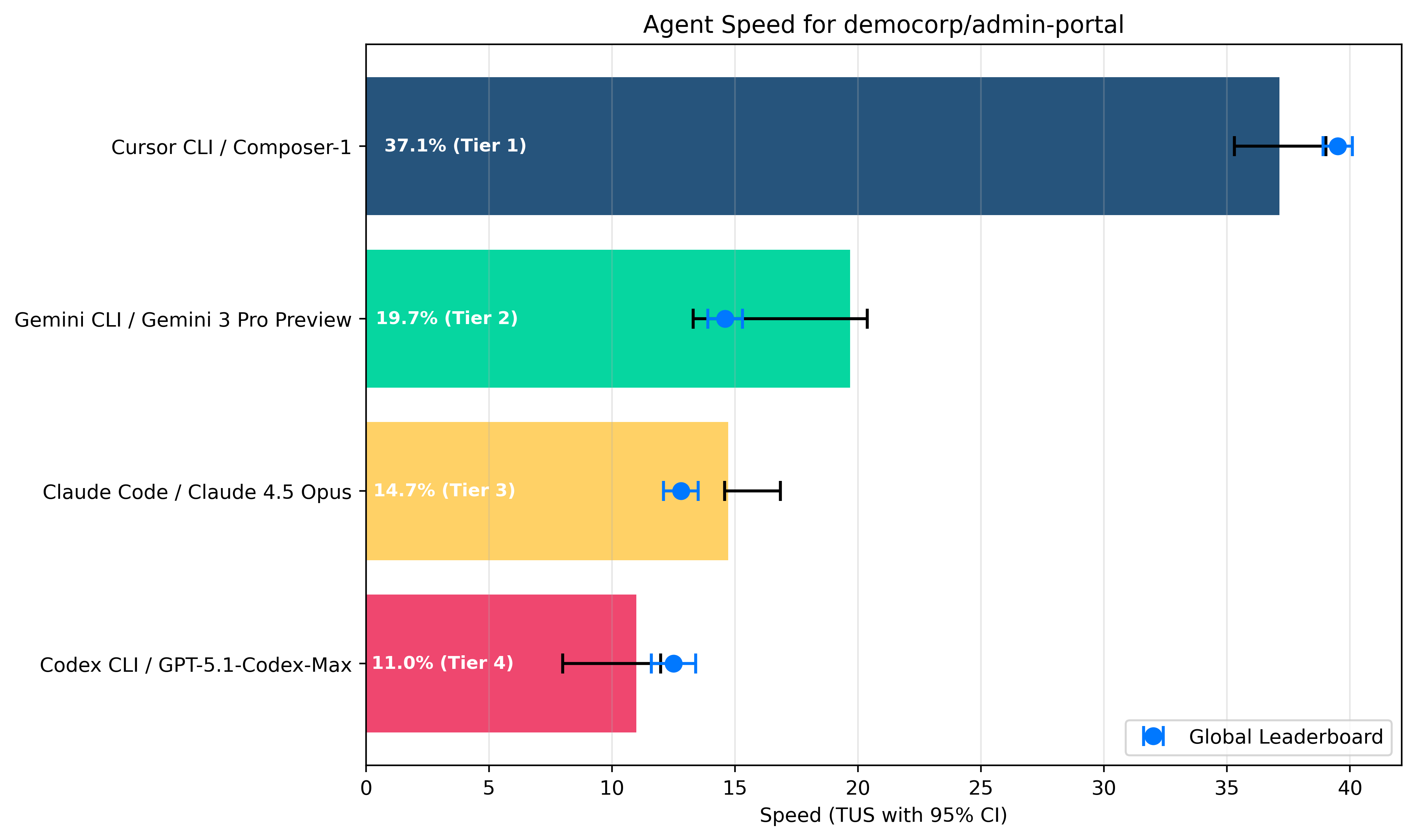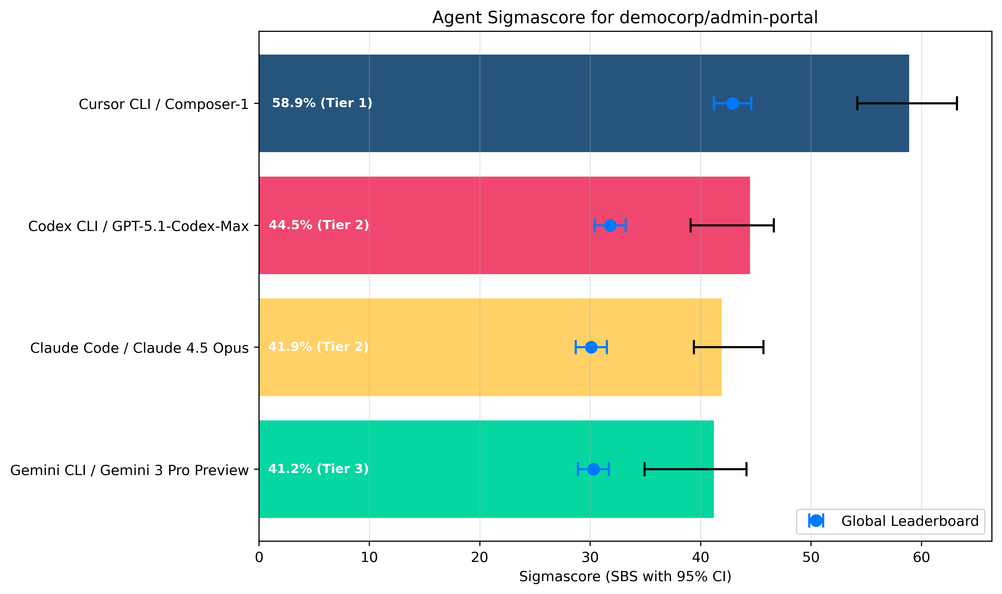 Cursor CLI / Composer 1 significantly over performs on your codebase compared to its results on the Sigmabench global leaderboard. This is great news for DemoCorp: the fastest agent/model combination is also quite accurate on your codebase.